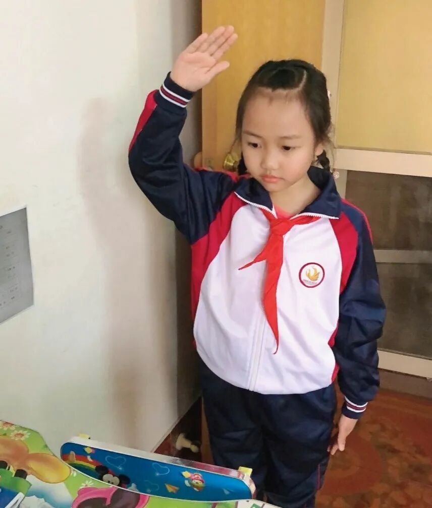 宅在家也要有仪式感!随着视频中升旗仪式的口令响起,全体师生庄严肃立,少先队员们高举右臂,面向视频里冉冉升起的五星红旗,面对冉冉升起的国旗庄严行礼,在雄壮的国歌声中,接受了一次深刻的爱国主义教育。