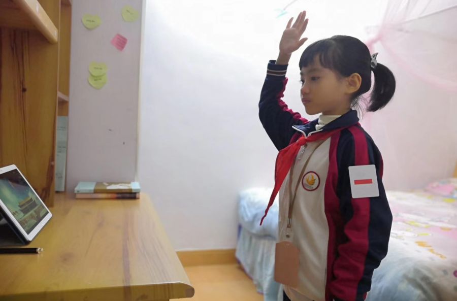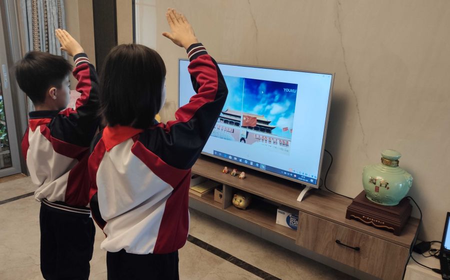 八点整,揭东区第一小学举行了一场特别的“云”升旗仪式。