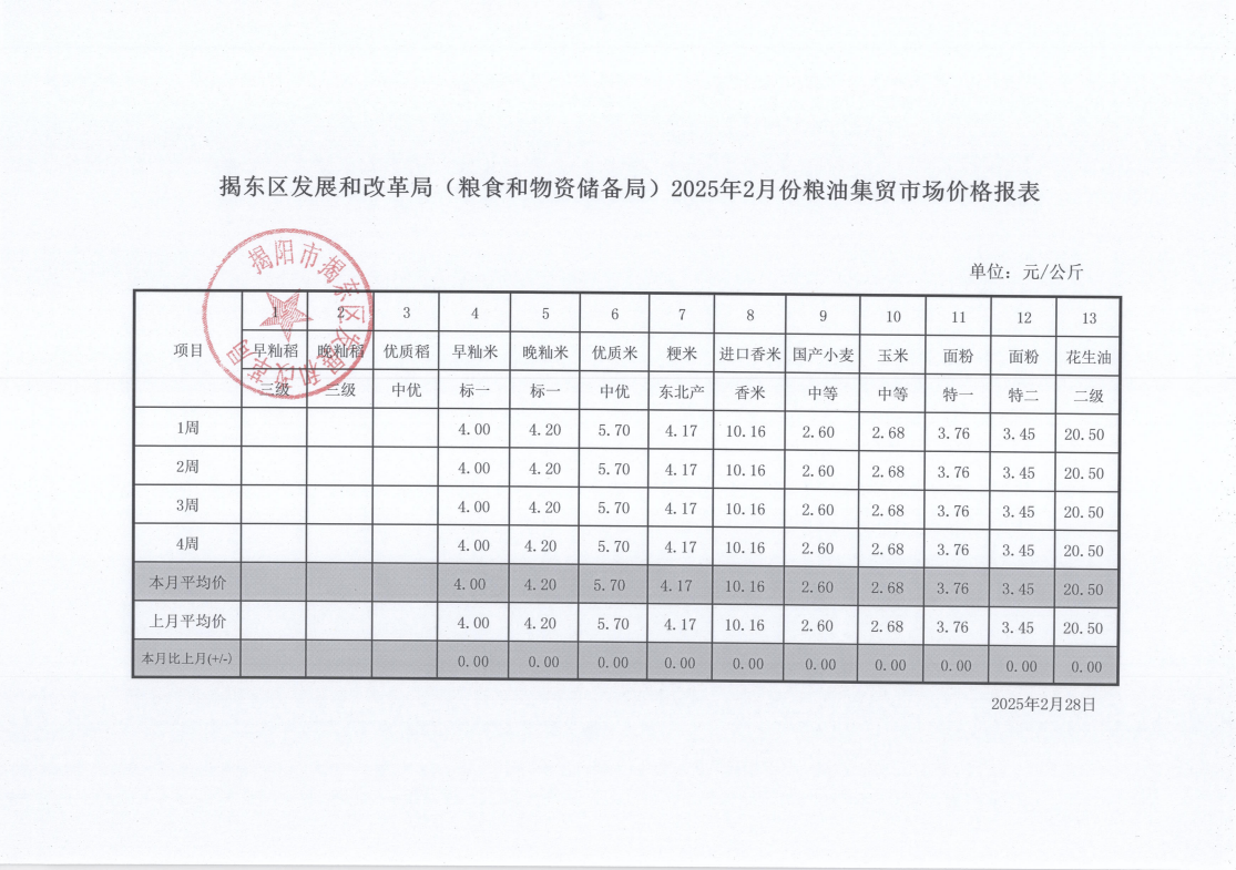 2025年2月份粮油价格信息变化情况是:标一早籼米、标一晚籼米、中优优质米、东北产粳米、进口香米、中等国产小麦、中等玉米、特一面粉、特二面粉、二级花生油平均价格均与上月持平。标一早籼米月末每公斤4.00元,标一晚籼米月末每公斤4.20元,中优优质米月末每公斤5.70元,东北产粳米月末每公斤4.17元,进口香米月末每公斤10.16元,中等国产小麦月末每公斤2.60元,中等玉米月末每公斤2.68元,特一面粉月末每公斤3.76元,特二面粉月末每公斤3.45元,二级花生油月末每公斤20.50元,均与月初持平。