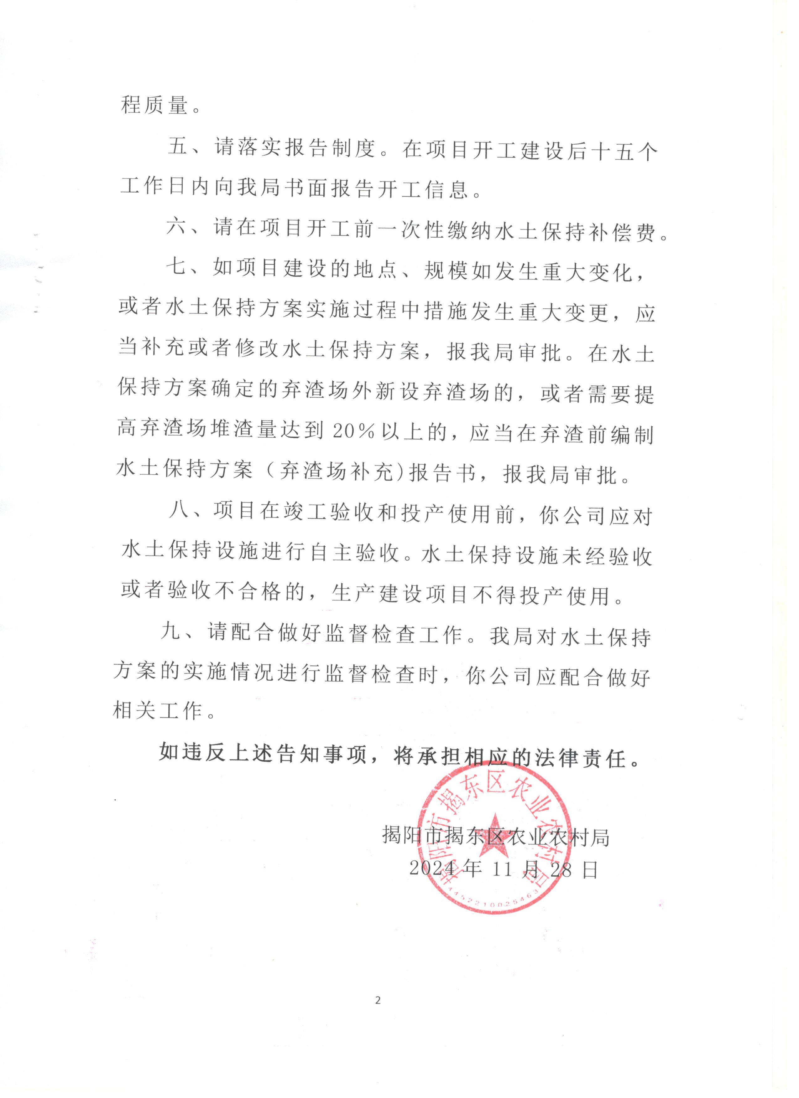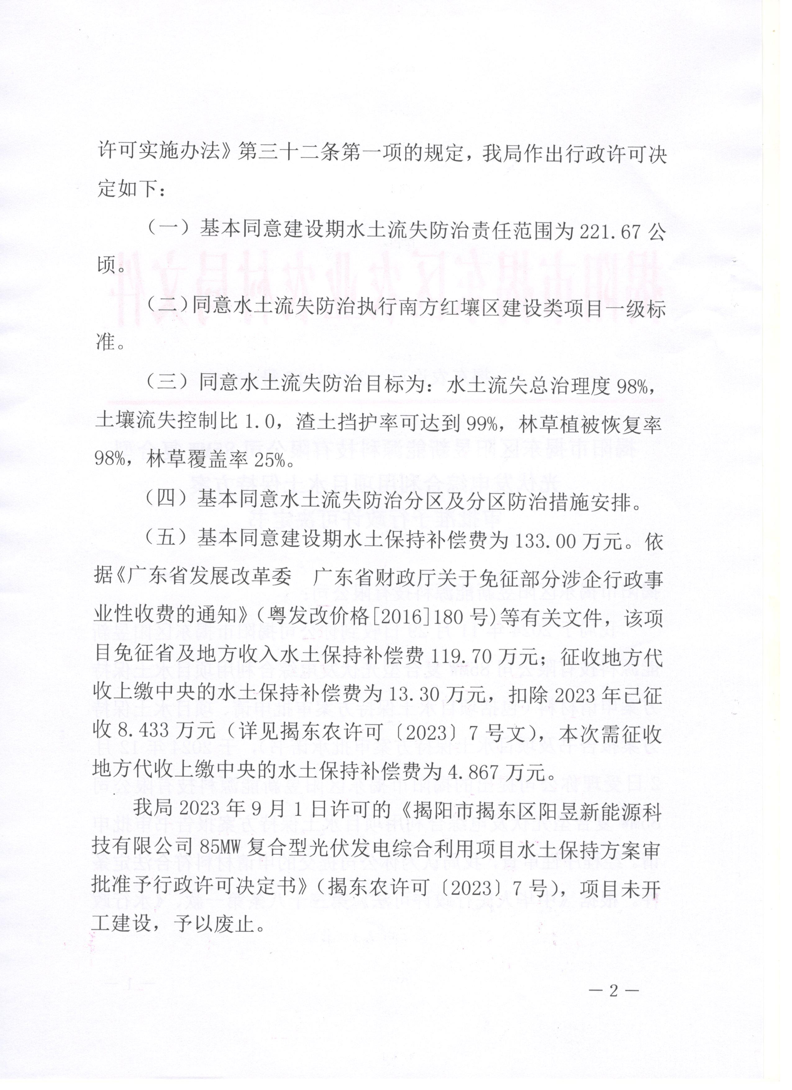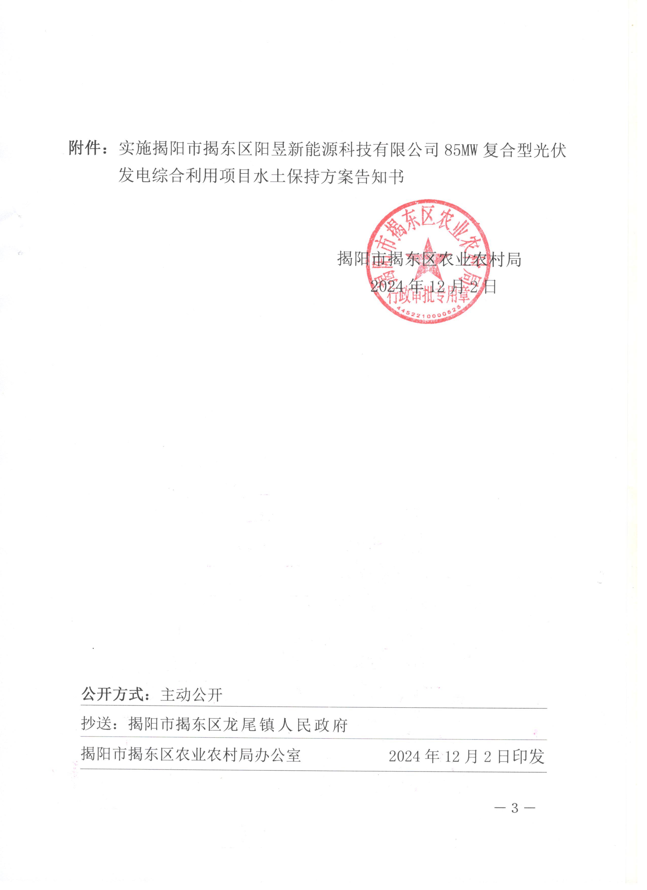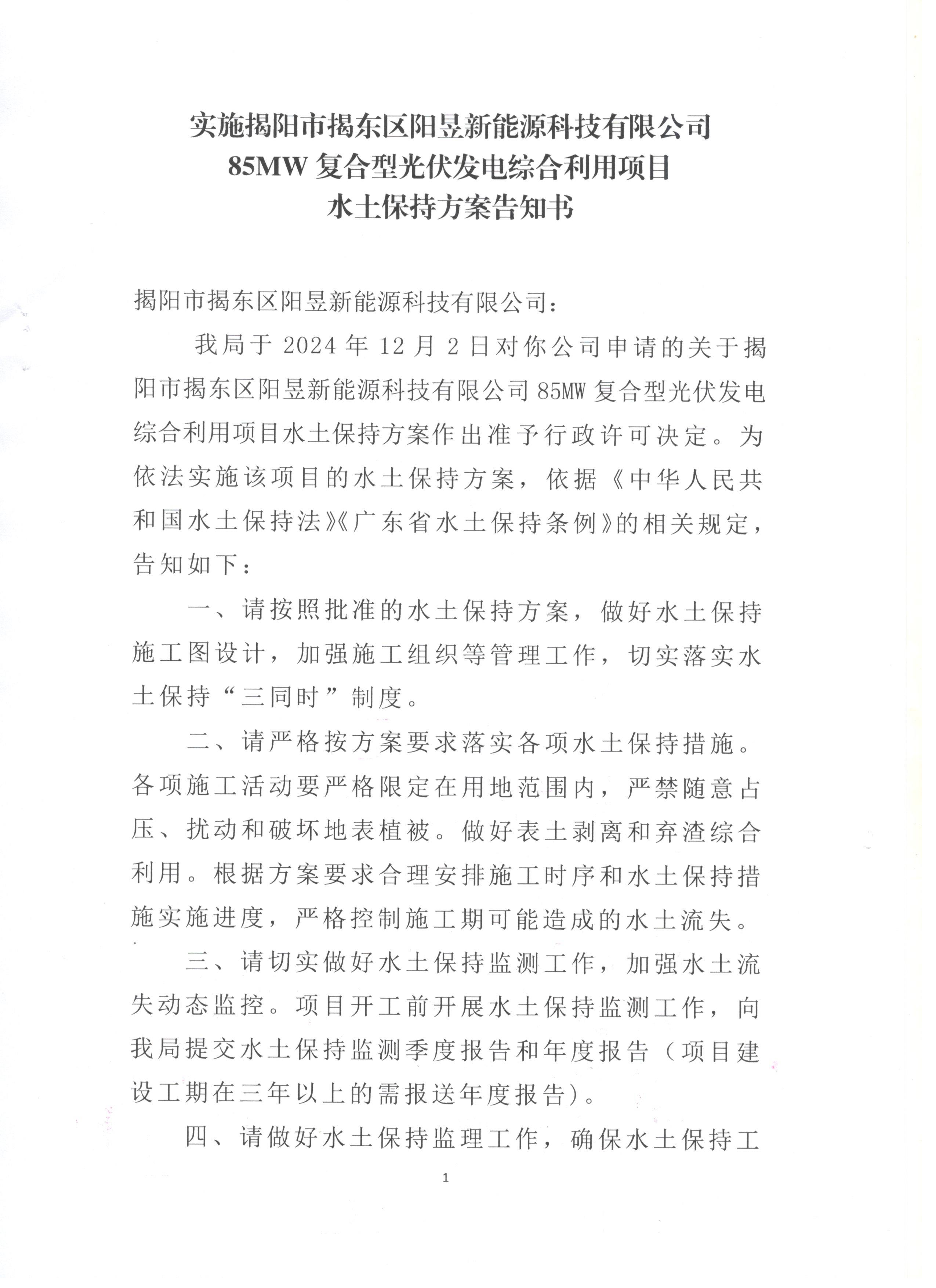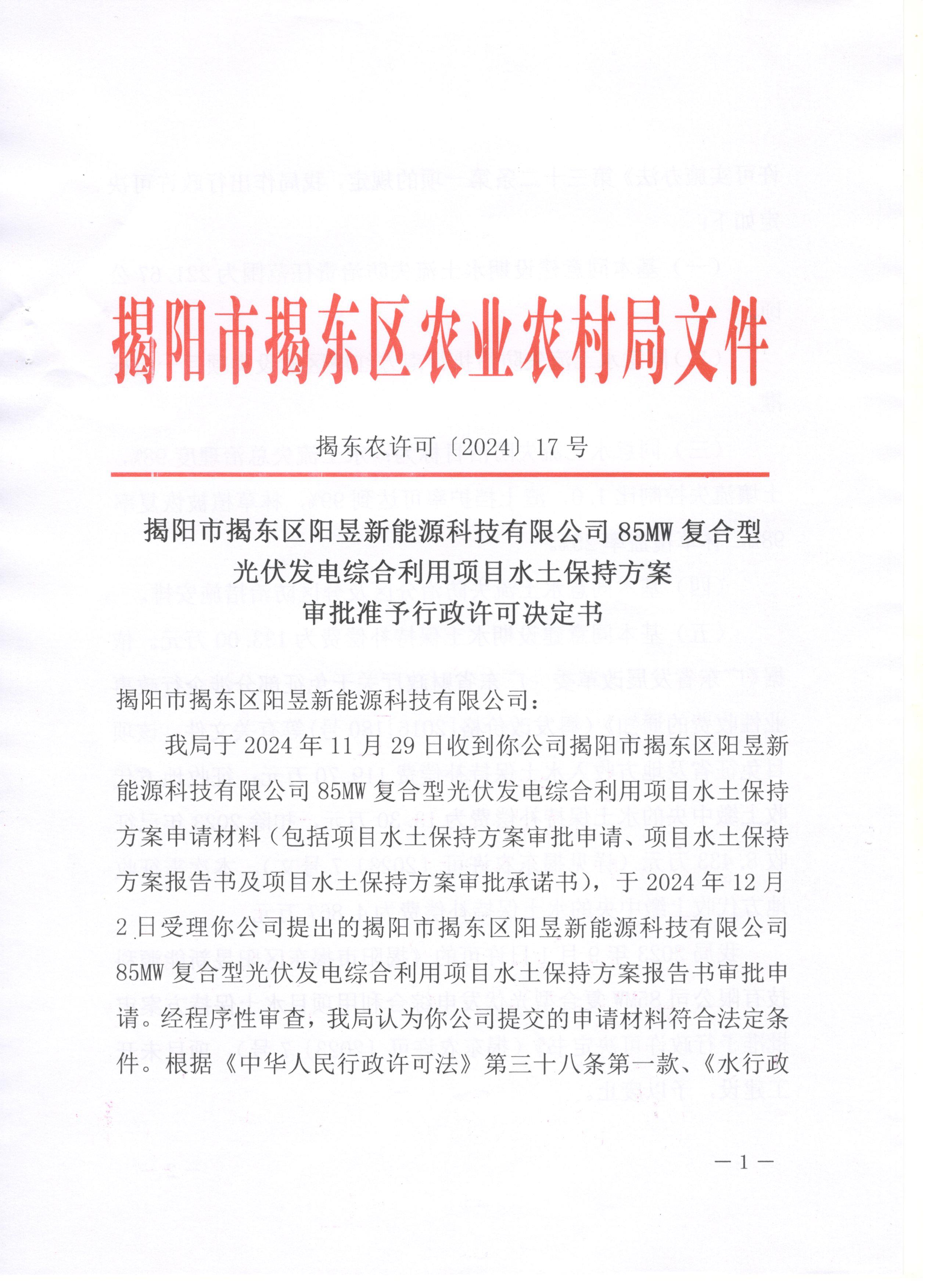 揭阳市揭东区阳昱新能源科技有限公司85MW复合型光伏发电综合利用项目水土保持方案审批准予行政许可决定书
