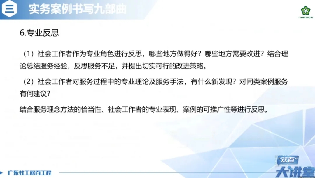 事务岗社工:本期培训通过案例剖析与社工站实践经验碰撞,既强化了社工实务案例书写提炼意识,又为社工站标准化建设提供了可复制的经验,具有很强的借鉴、学习和启发意义,有助于帮助“双百”社工加深对专业服务标准化、专业化、品牌化的理解,更好推动本土服务创新,实现从“会做”到“会写、会讲”的专业跃升,为广东兜底民生服务注入新的发展动能,持续提升困难群众和特殊群体的获得感与幸福感。 服务岗社工:黄霞老师分享实务案例书写与经验,详细剖析、讲解了实务案例的各个结构,让我有很大的启发。印象深刻的是黄老师分享分析预估技巧:可以提炼小标题+分析,也可以巧用生态系统图、社区资源图进行分析预估,更加直观明了。另外,在专业反思这板块,通过本次学习,让我有更加清晰的思路去更好完成这板块的内容。