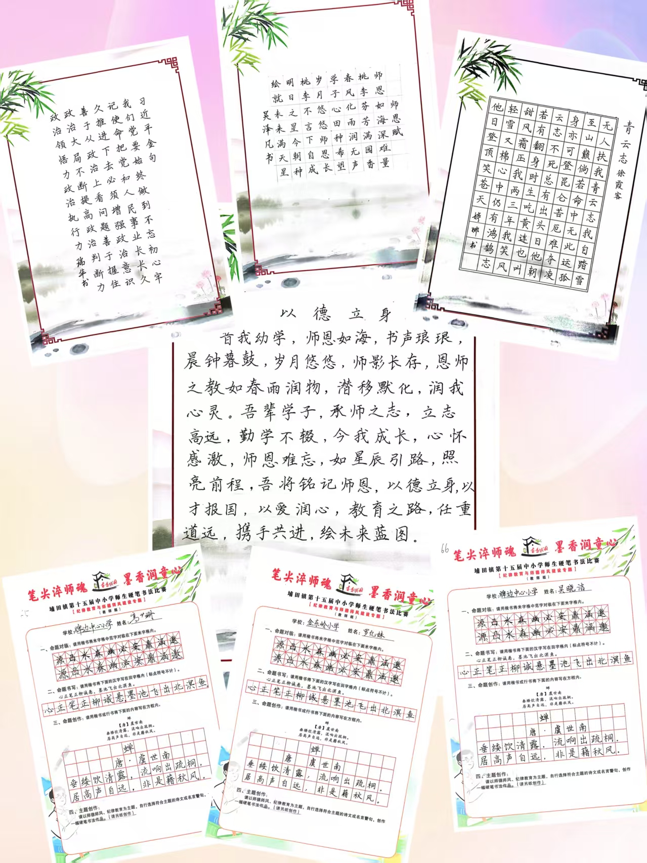 比赛设置教师组与学生组,分硬笔书法、粉笔字两类项目开展,紧扣纪律教育、师德师风建设核心专题,聚焦廉洁从教、身正为范、立德树人、严守纪律等关键要义,为师生搭建了切磋书法技艺、传承优良师风的交流平台。赛场之上,师生们凝神聚力、提笔挥毫,尽显扎实功底与奋进姿态:硬笔作品笔锋刚劲、结构严谨,粉笔板书清秀工整、布局匀称,一笔一划间,既展现出对书法艺术的执着追求,更饱含着对师德规范的深刻认同与坚定坚守,充分彰显了全镇中小学师生积极向上的精神风貌。