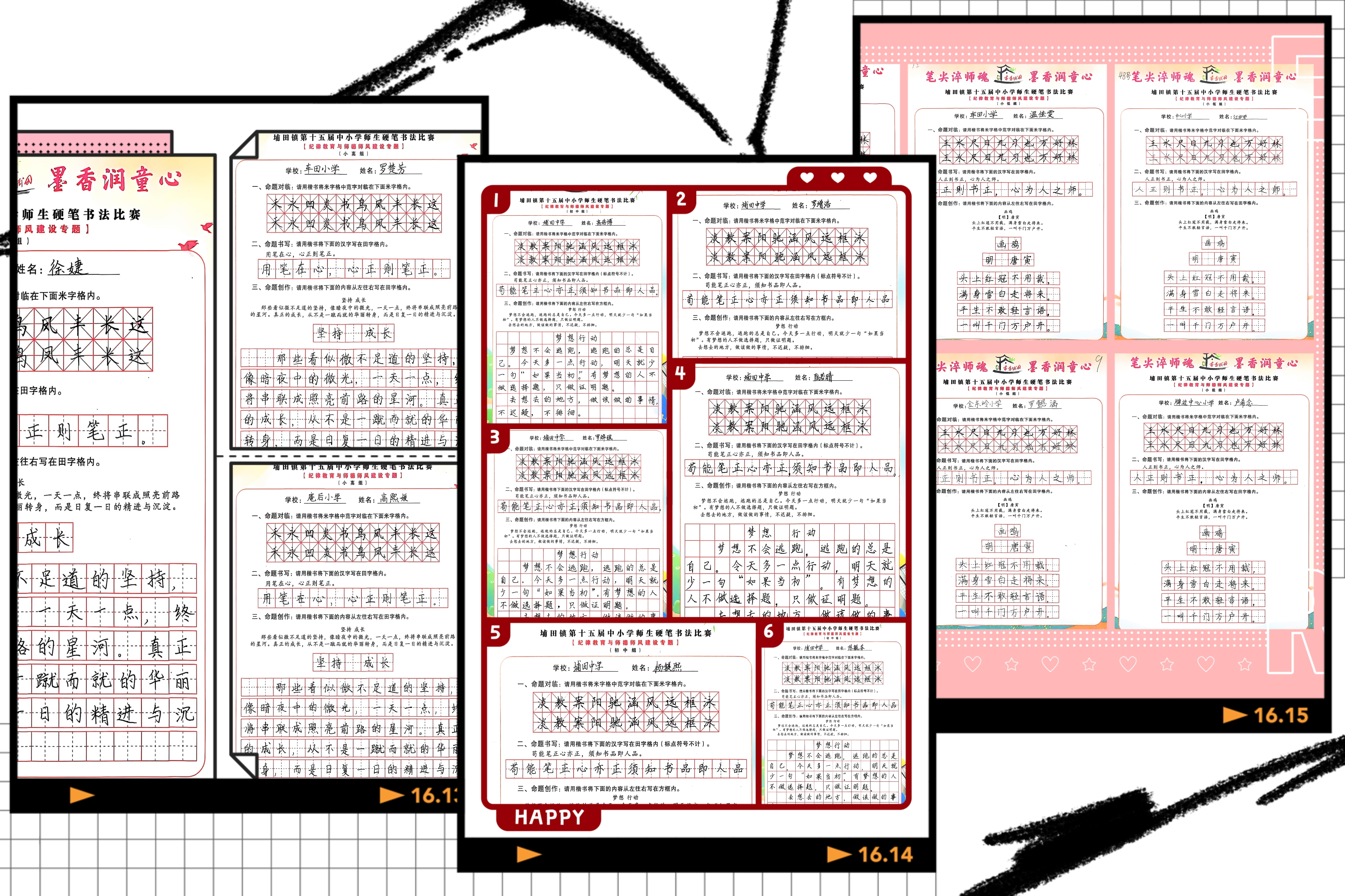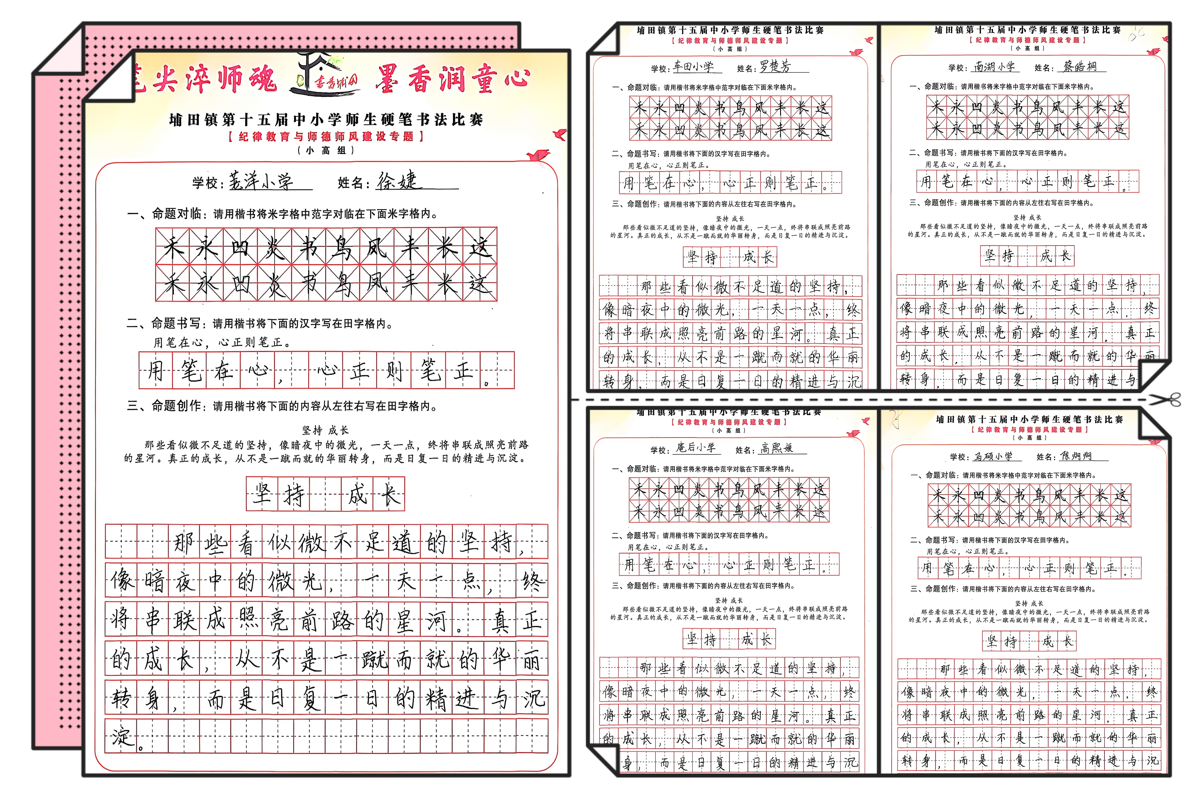 参赛学生紧扣“坚持、成长”等命题,以楷书精准呈现“用笔在心,心正则笔正”的书法真谛,在命题创作中书写“那些看似微不足道的坚持,像暗夜中的微光,一天一点,终将串联成照亮前路的星河”等励志内容,将少年奋进之志与师德传承之意融入笔墨,展现出扎实的书写功底与正向的价值追求。埔田中学的高浩博、荖洋小学徐婕、车田小学罗楚芳等同学的作品,成为学生组中的优秀代表。