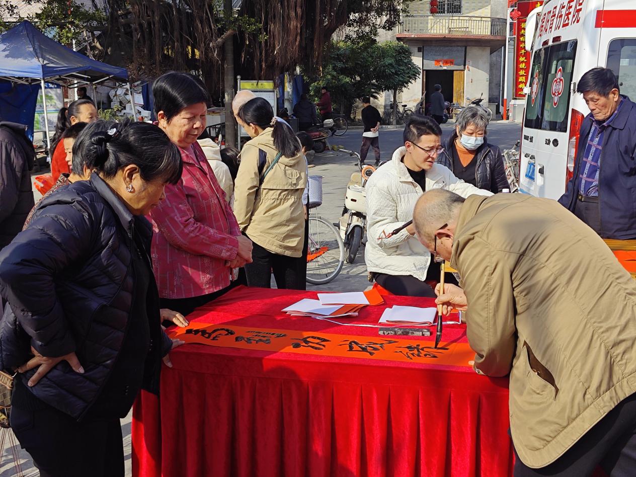 翰墨飘香迎新春,书法爱好者现场挥毫,为群众书写赠送春联,传递节日祝福。现场还展示了刘惠平原创手绘“红桃粿”拟人化IP国宝系列文创周边产品,彰显地方文化魅力。活动坚持以“家家都过幸福年”为目标,不仅在现场设置“送温暖”摊位,还组织镇村干部走访慰问困难家庭、重病群众,送上粮油、棉被等慰问物资,详细了解生活需求,让关怀真正走进家门、暖进心里。
