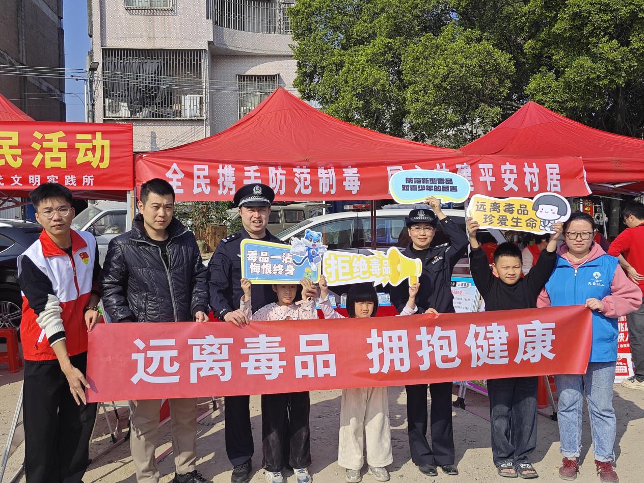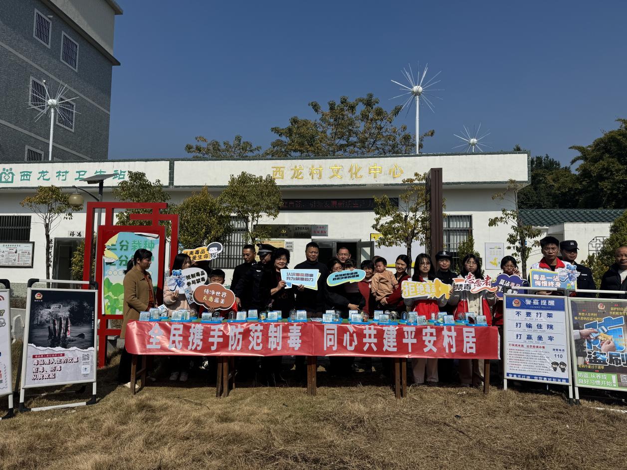 同日,我镇组织镇平安办、派出所、西龙村社干部、党员志愿者、返乡大学生志愿者,联合揭东禁毒大队,前往霖磐镇西龙村开展“全民携手防范制毒 同心共建平安村居”专项禁毒宣传活动,通过设立咨询台、展示仿真毒品模型、发放宣传手册、现场讲解、组织观看禁毒宣传片等多种形式,向群众详细普及毒品危害、防毒技巧及相关法律法规,提升群众识毒、防毒、拒毒的意识与能力,营造全民参与禁毒的浓厚社会氛围,筑牢乡村禁毒坚实防线。