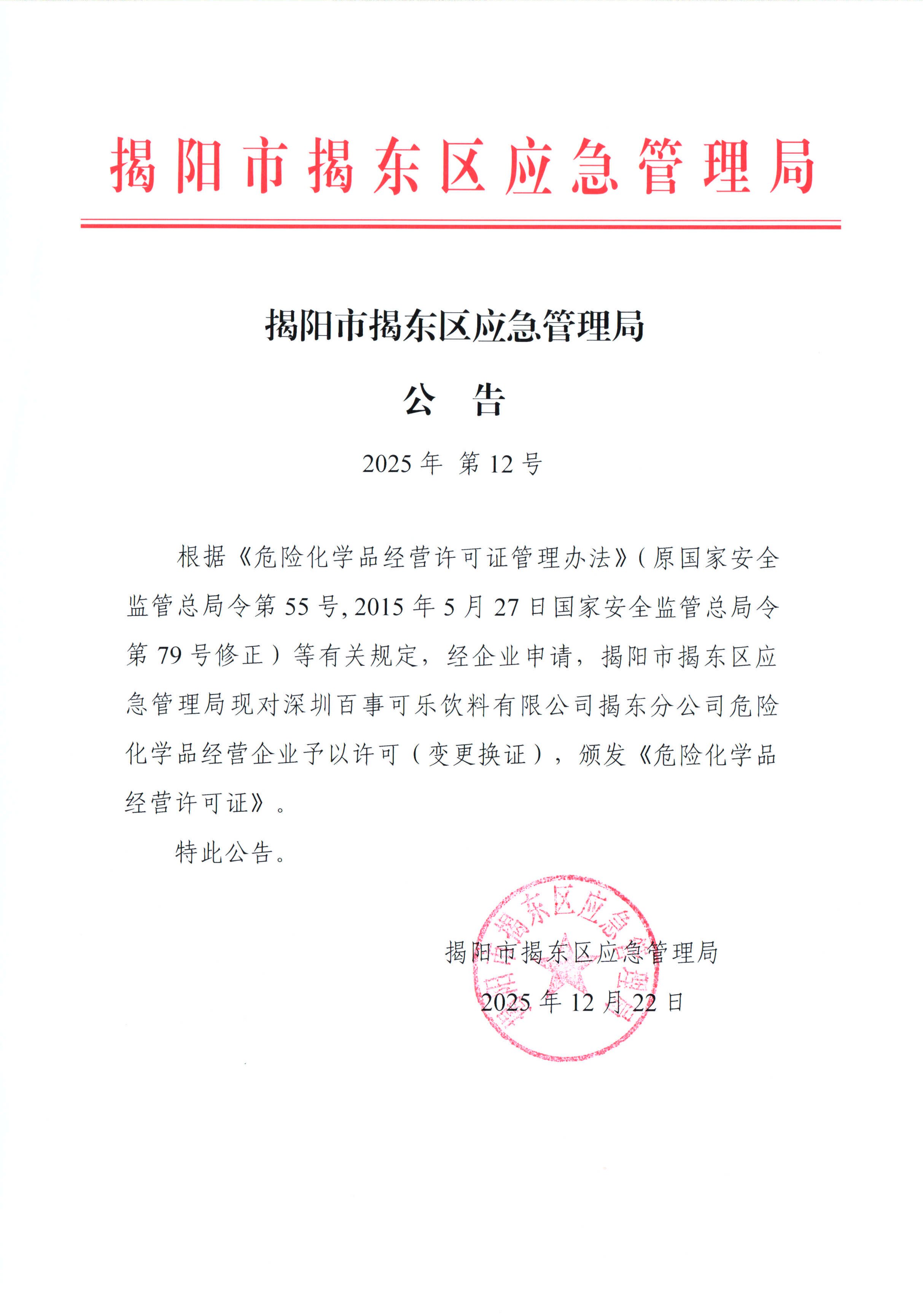 揭阳市揭东区应急管理局公告(2025年第12号)