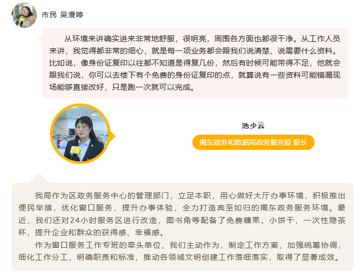通过制订《揭东区窗口服务工作专班开展文明创建工作方案》,我区细化工作任务,明确牵头部门、责任部门,推动工作落细落实。加强政务服务中心文明创建,推动各领域扎实开展文明创建工作,优化窗口服务流程, 积极推出便民举措,进一步提升窗口服务质效,提高群众获得感、满意度,打造窗口服务品牌。