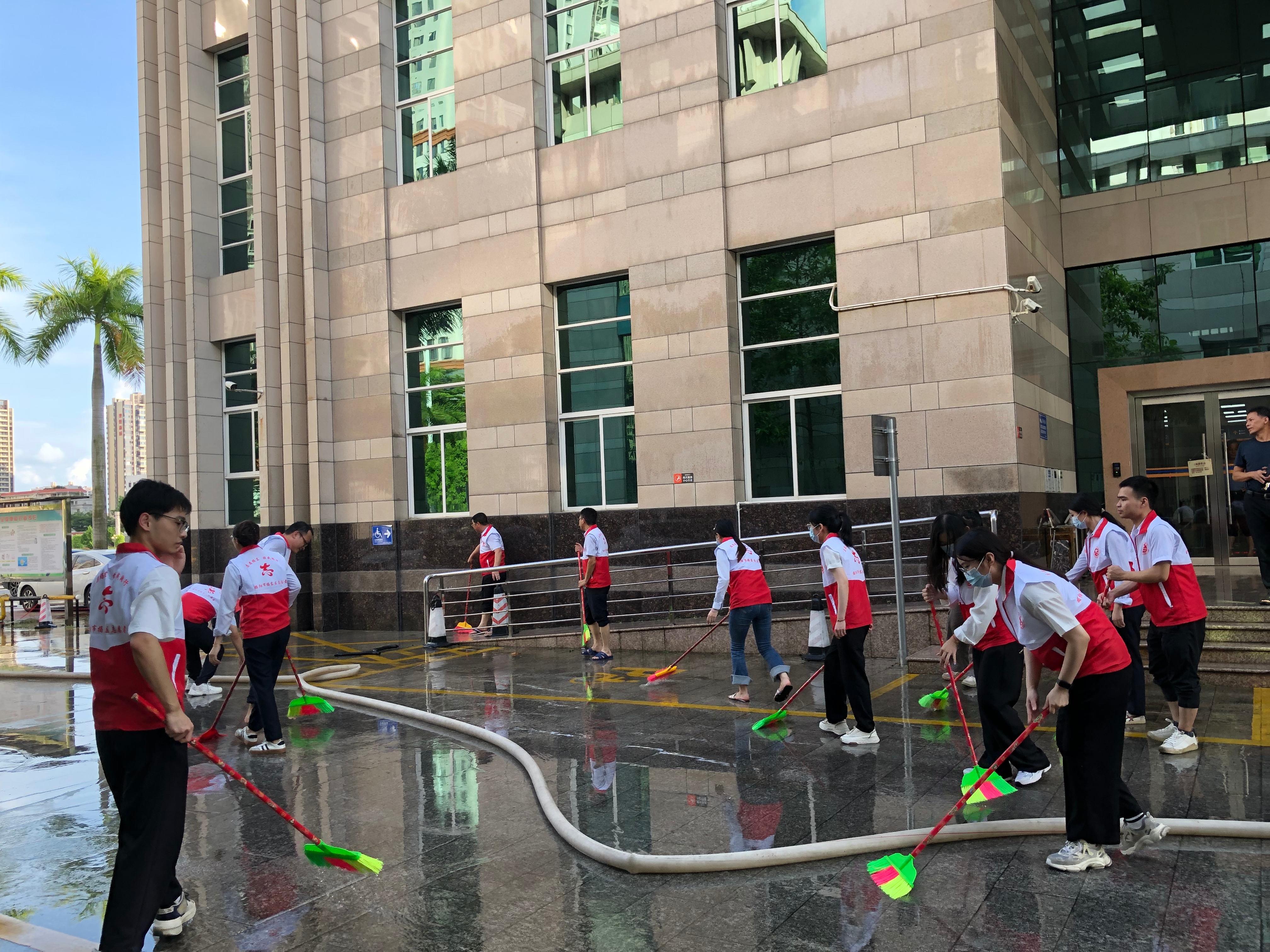 窗口结束对外服务后,局党组书记陈和藩和局长陈旋宇组织志愿者们开展“爱家爱文明 揭东在行动”创文活动,对中心门口、周边停车场、通道等区域进行水洗,全面清除杂草、垃圾及卫生死角,营造干净、文明、和谐、卫生的办事环境。