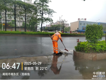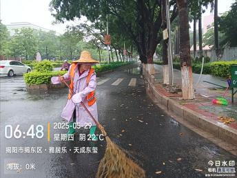 在苍茫的雨幕中,环卫工人手握扫帚,一下又一下地清扫着地面上的垃圾,用他们的双手,为城市创造了一个更加宜居的环境。