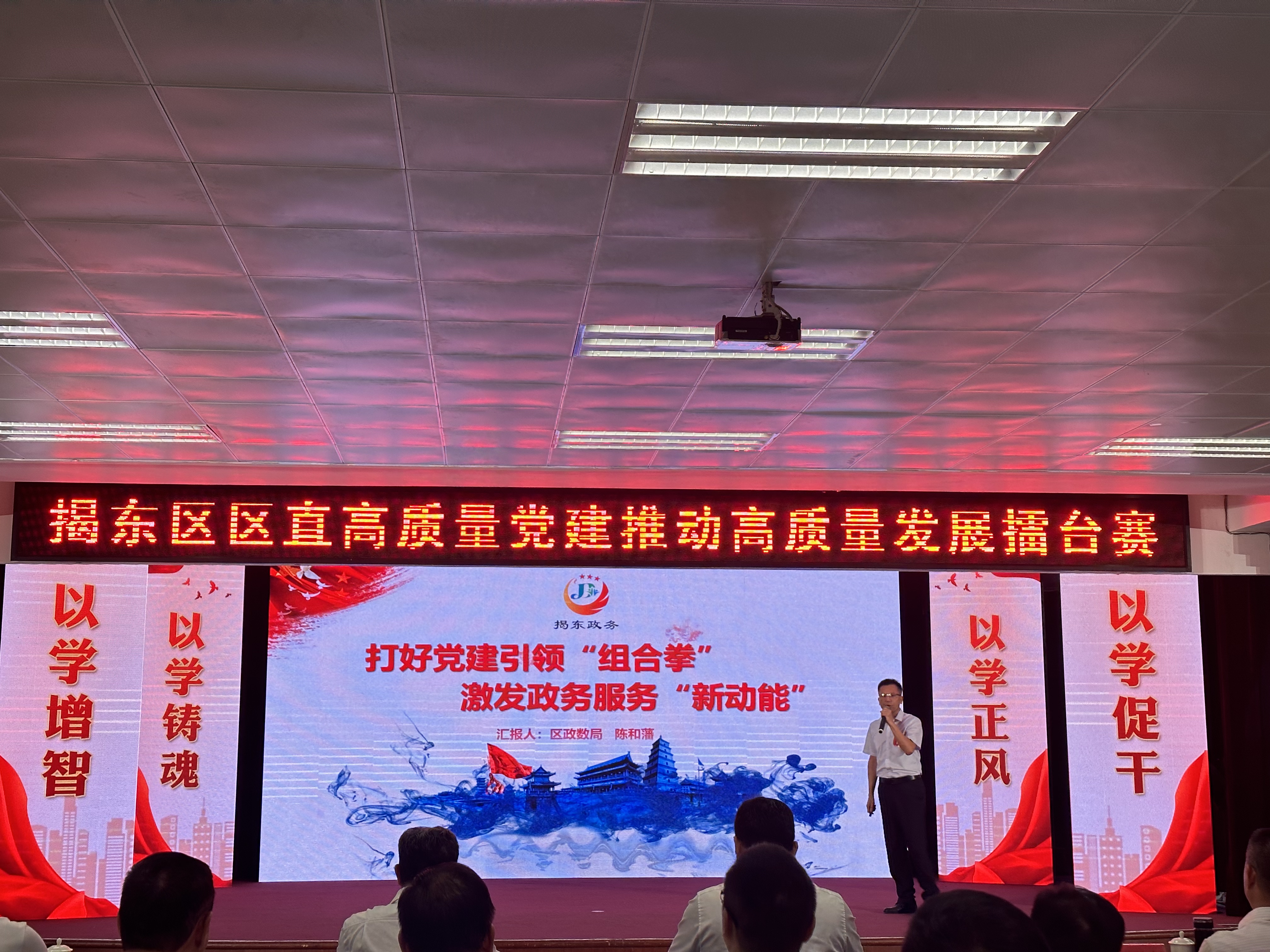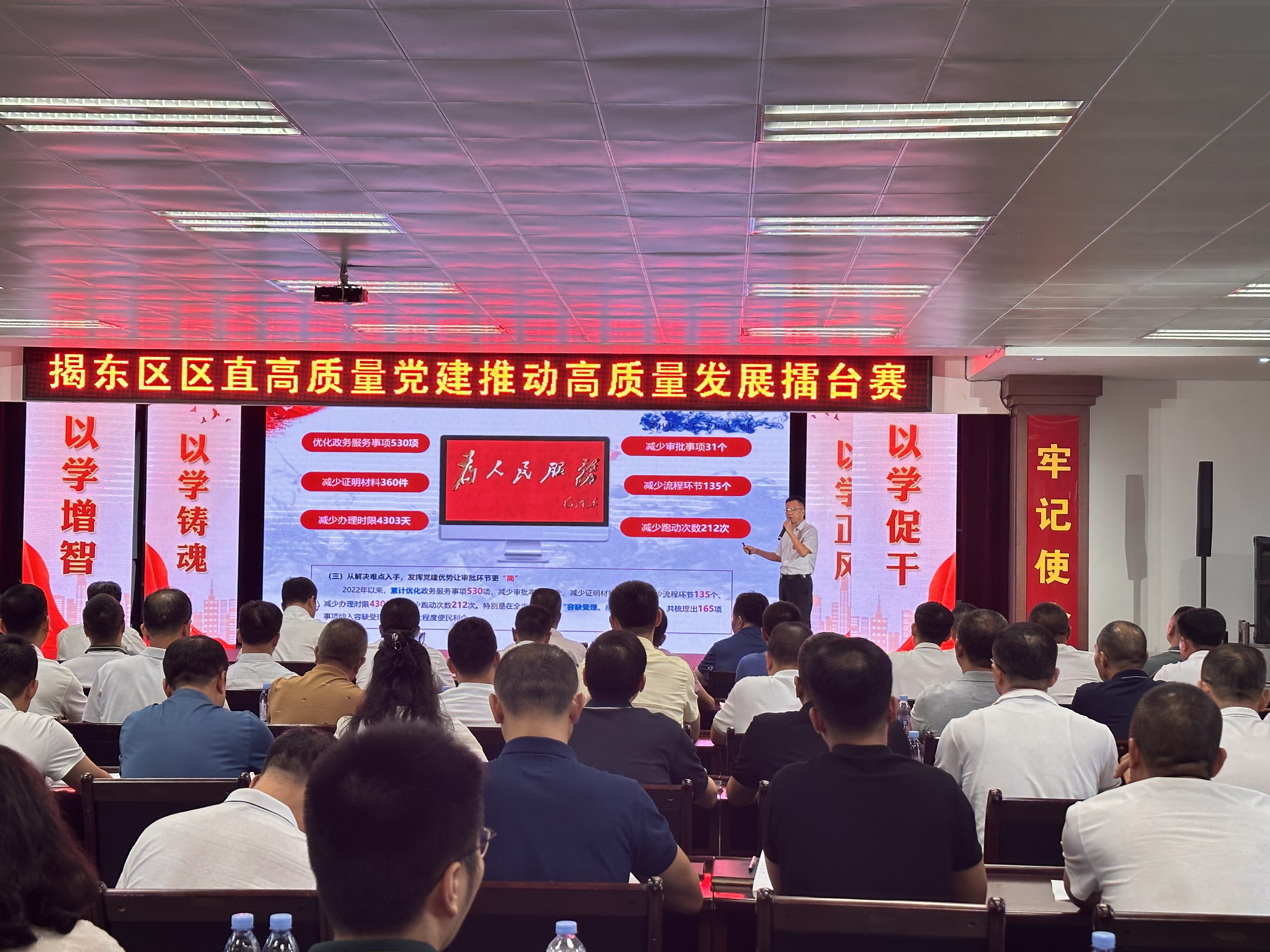 为深入学习贯彻党的二十大精神,全面贯彻落实区三届三次党代会工作部署,推动区直各单位抓党建促发展工作再上新台阶。8月18日下午,揭东区举办区直高质量党建推动高质量发展擂台赛,通过同台竞演、打擂评比的方式,亮“答卷”、晒“成绩”、展“思路”,全面展示高质量党建推动高质量发展的新成果,形成以赛促建、以赛促干、争先创优的浓烈氛围,为揭东奋力绘好“六张地图”、实现“三个打造”奋斗目标提供坚强组织保证。