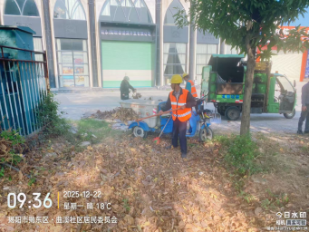 环卫工作在清理路肩绿化带下的枯枝烂叶: