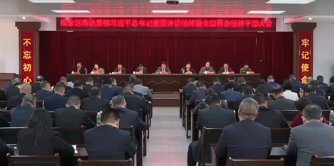 3月16日下午,揭东区召开传达贯彻习近平总书记重要讲话精神暨全国两会精神干部大会,深入学习贯彻习近平总书记在全国两会期间的重要讲话精神和全国两会精神,全面贯彻落实省、市干部大会部署要求,动员全区上下进一步统一思想、凝聚共识,锚定目标、真抓实干,奋力推动党中央决策部署及省委、市委工作要求在揭东落地生根,以“守正道、讲实干、开新局”的奋斗姿态,在“十五五”开局之年展现新气象、实现新作为。