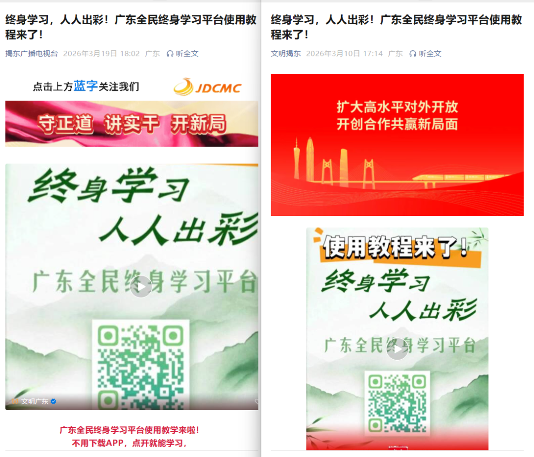 揭东区着力构建线上线下深度融合的宣传矩阵,全方位拓展广东全民终身学习平台的知晓度与覆盖面。线上充分运用“文明揭东”“揭东广播电视台”等政务新媒体矩阵,持续推送平台使用指南与课程;线下各实践所(站)利用宣传栏、服务台、户外电子屏等载体广泛展示、张贴平台二维码,充分向广大群众宣传推介。通过立体化、多层次的宣传引导,营造“人人皆学、处处能学、时时可学”的浓厚氛围。